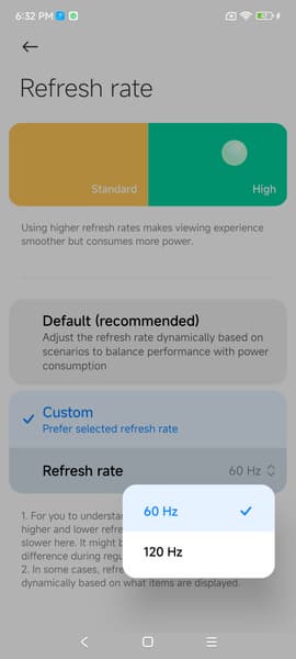 В настройках экрана можно включить режим с повышенной до 120 Гц частотой обновления: