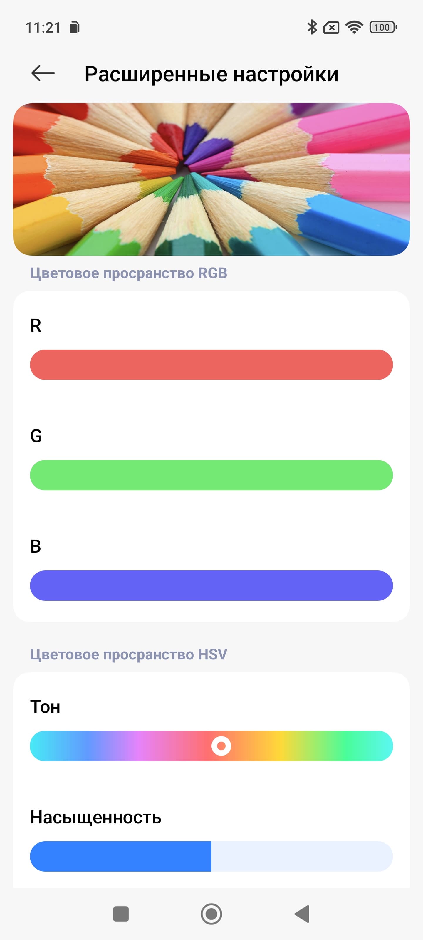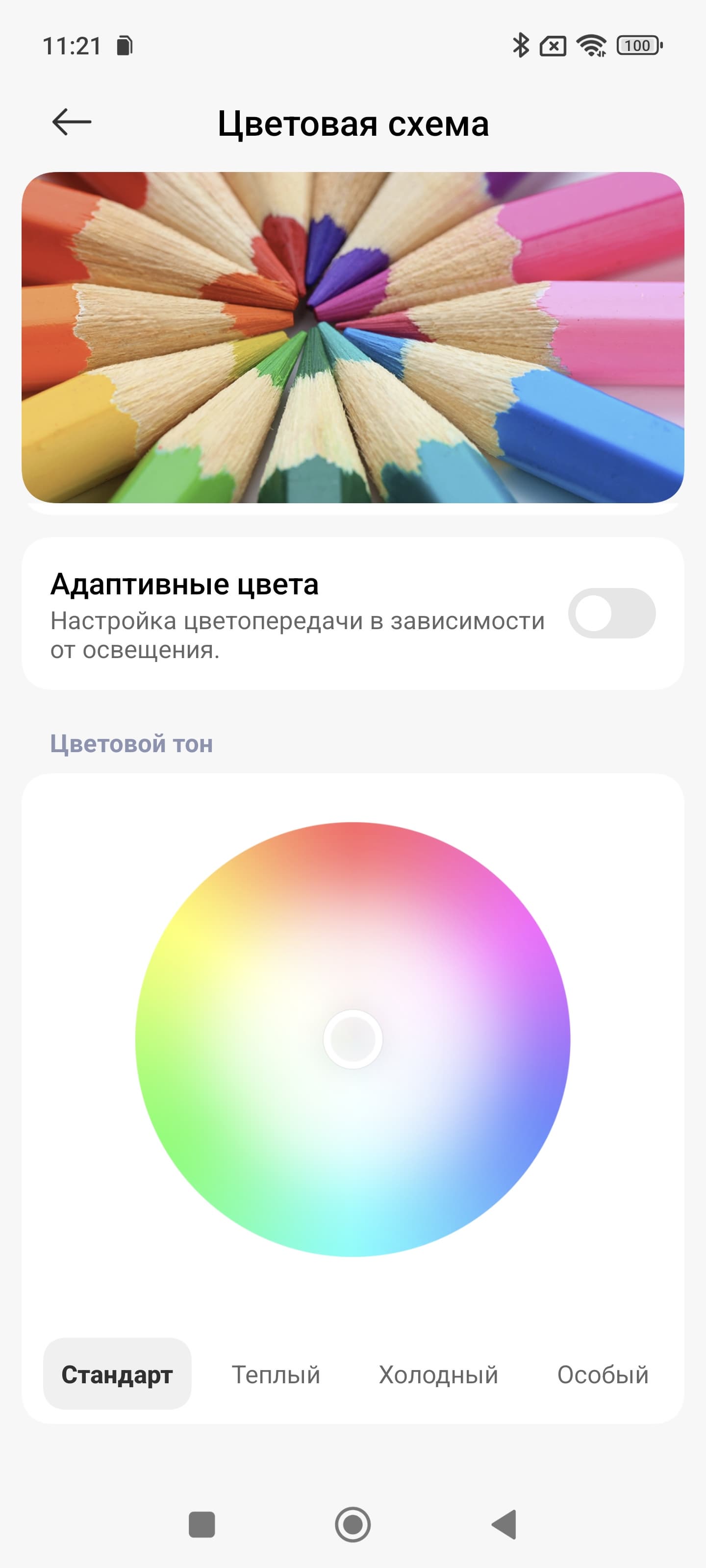 Таким образом профиль Насыщенные — принудительное расширение цветового охват до максимального, Яркие или P3 — коррекция до охвата DCI-P3, sRGB — коррекция до sRGB. Стандартные Pro или Исходный — коррекция (по возможности) охвата до прописанного профиля в изображении при выводе в программе Галерея, а в сторонних программах — вывод в sRGB. При этом только в случае профиля Исходный цветовой баланс по умолчанию максимально близок к стандартному.