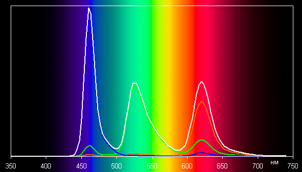 В первом случае спектры компонент (то есть спектры чистых красного, зеленого и синего цветов) очень хорошо разделены: