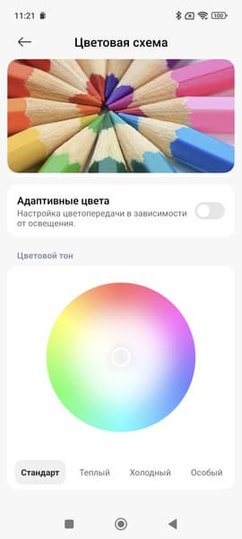 Присутствует функция Адаптивные цвета, которая, если ее включить, подстраивает цветовой баланс под условия окружающей среды. Мы включили эту функцию и проверили, как она работает (профиль Исходный):