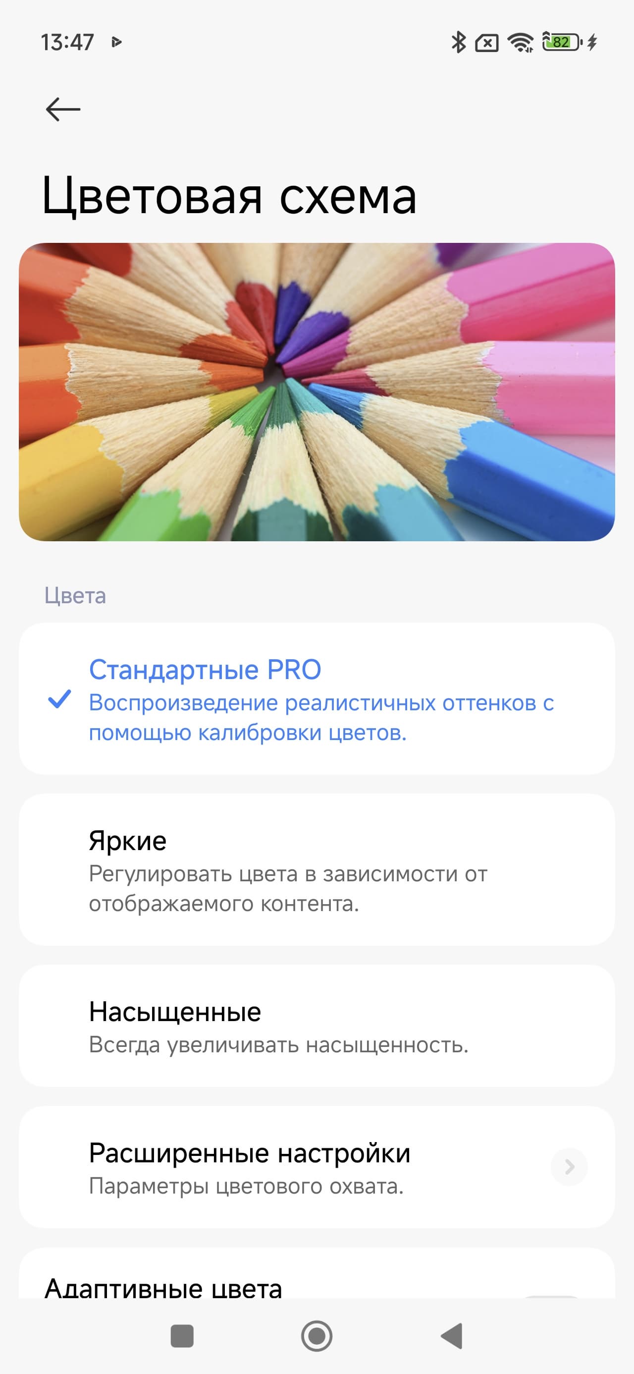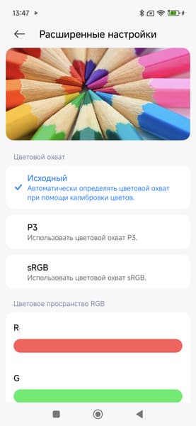 Таким образом профиль Насыщенные — принудительное расширение цветового охват до максимального, Яркие или P3 — коррекция до охвата DCI-P3, sRGB — коррекция до sRGB. Стандартные Pro или Исходный — коррекция (по возможности) охвата до прописанного профиля в изображении при выводе в программе Галерея, а в сторонних программах — вывод в sRGB. При этом только в случае профиля Исходный цветовой баланс по умолчанию максимально близок к стандартному.