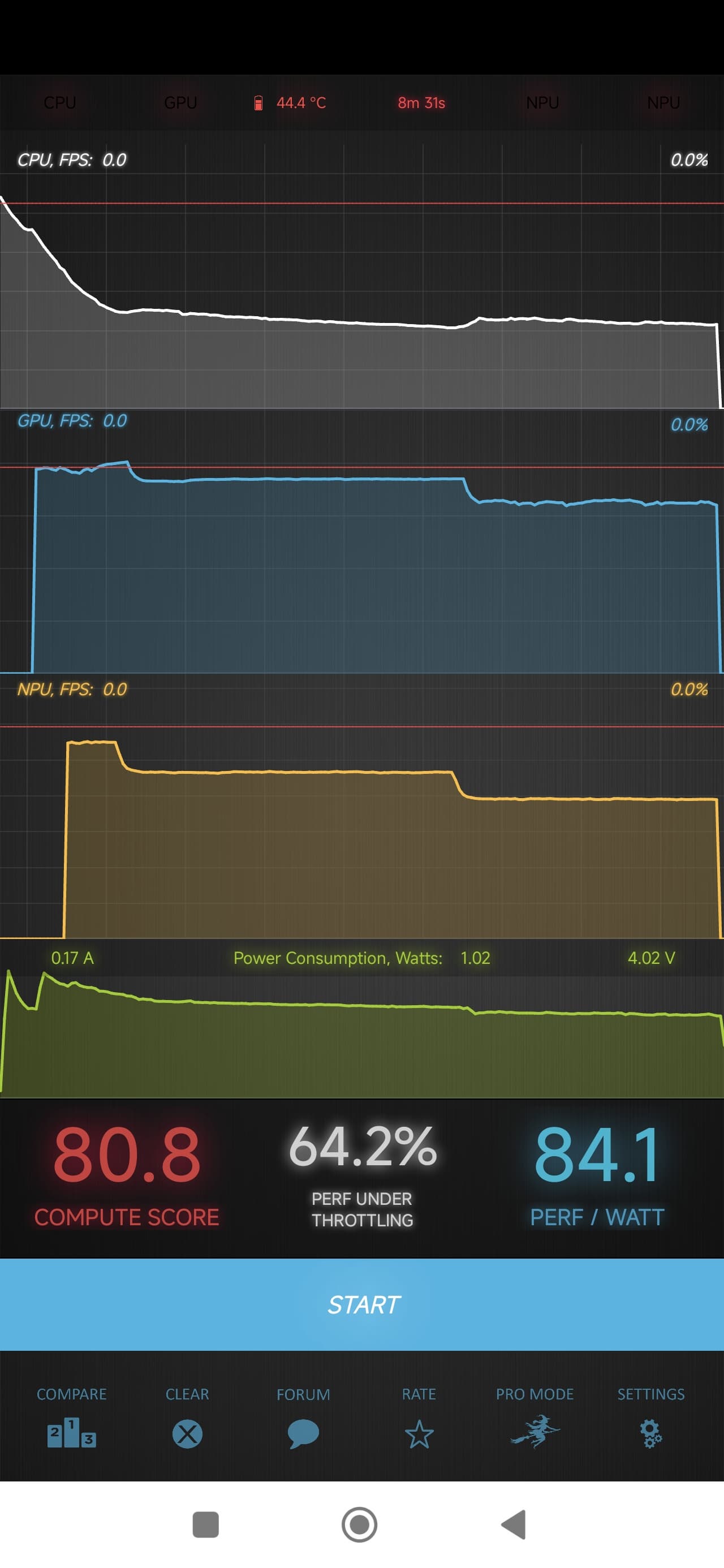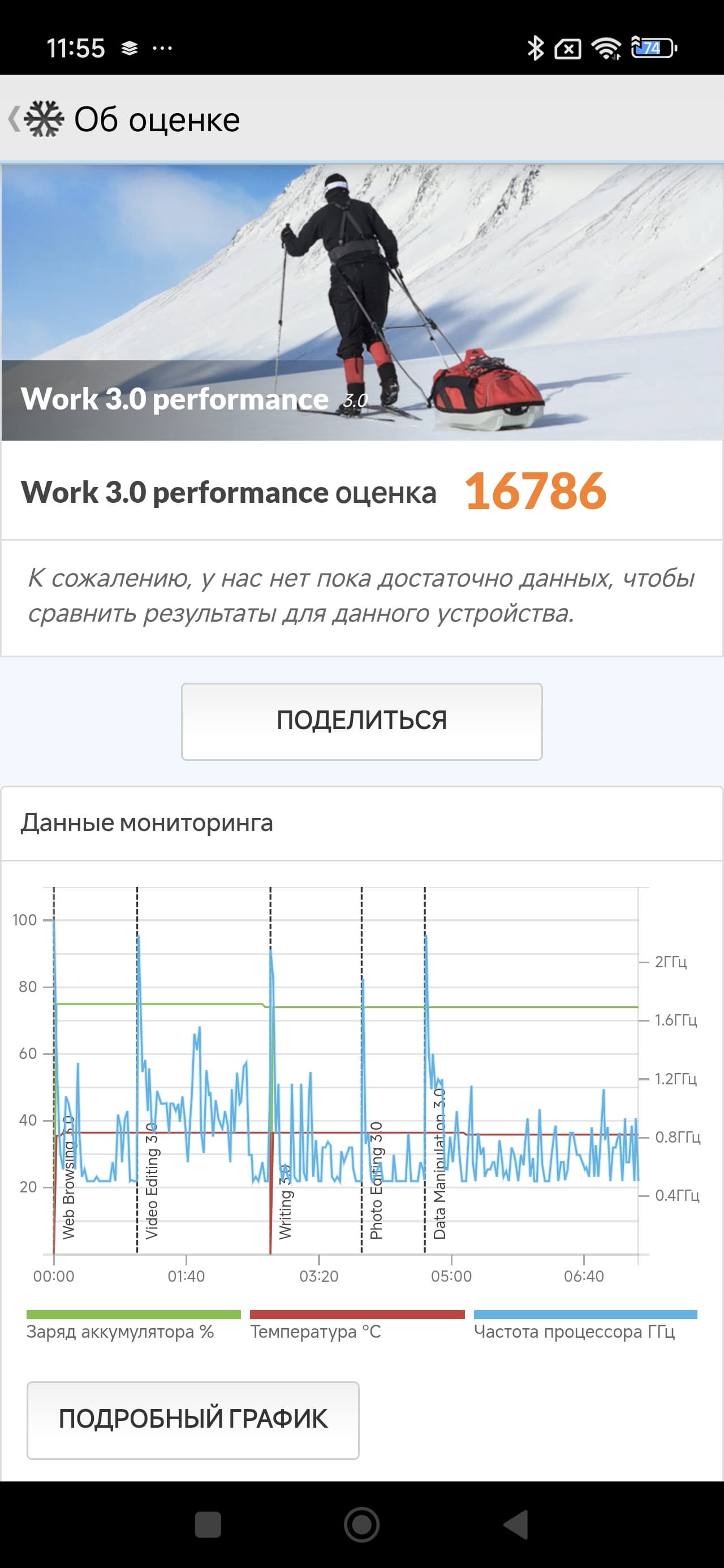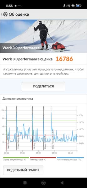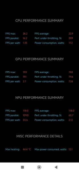 Тест на снижение производительности при нагреве мы проводим с помощью программы Burnout Benchmark, которая позволяет нагружать CPU, GPU и NPU. Уровень тротлинга GPU, согласно тестам, на удивление низок, хотя процессорные ядра тротлятся прилично.