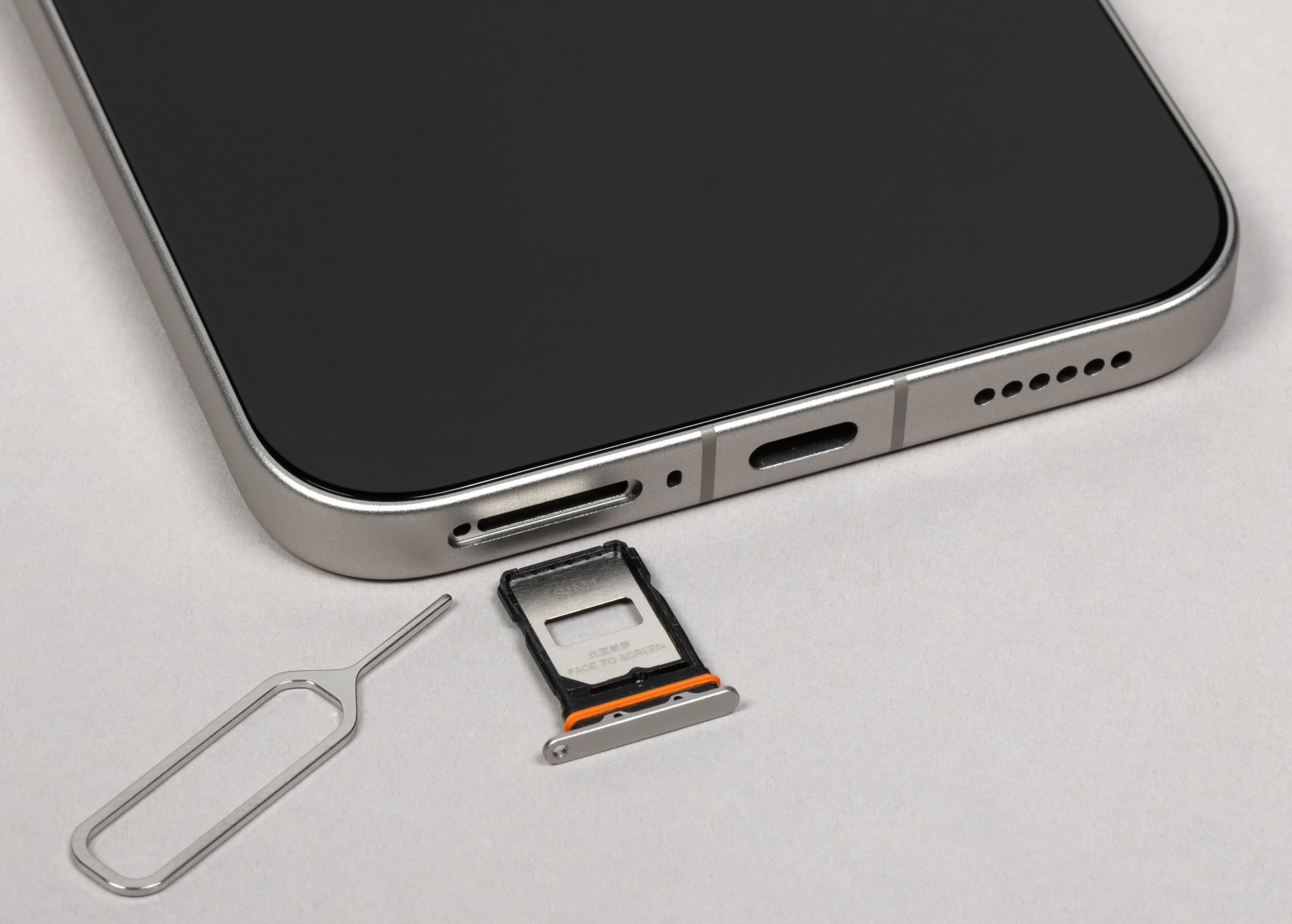 На торце снизу установлены динамик, разъем USB Type-C и микрофон. В выдвижной лоток можно установить карты Nano-SIM, для карты памяти microSD места не предусмотрено. Количество физических и виртуальных поддерживаемых SIM-карт зависит от модификации, их несколько для разных регионов.