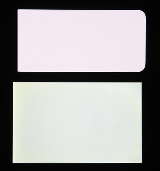 Экран характеризуется великолепными углами обзора. Яркость под углом у обоих экранов заметно уменьшается (если сравнивать с Nexus 7), но в случае смартфона падение яркости выражено гораздо меньше. В итоге, даже если установить формально одинаковую яркость, то экран этого смартфона визуально выглядит гораздо более ярким (в сравнении с ЖК-экранами), так как на экран мобильного устройства часто приходится смотреть как минимум под небольшим углом. Правда, у смартфона белый цвет при отклонении на большие углы приобретает легкий сине-зеленый оттенок, но черный цвет остается просто черным под любыми углами. Черный цвет, разумеется, остается просто черным под любыми углами. Он настолько черный, что параметр контрастности в данном случае неприменим. Для сравнения приведем фотографии, на которых на экраны смартфона и второго участника сравнения выведены одинаковые изображения, при этом яркость экранов изначально установлена примерно на 200 кд/м², а цветовой баланс на фотоаппарате принудительно переключен на 6500 К.