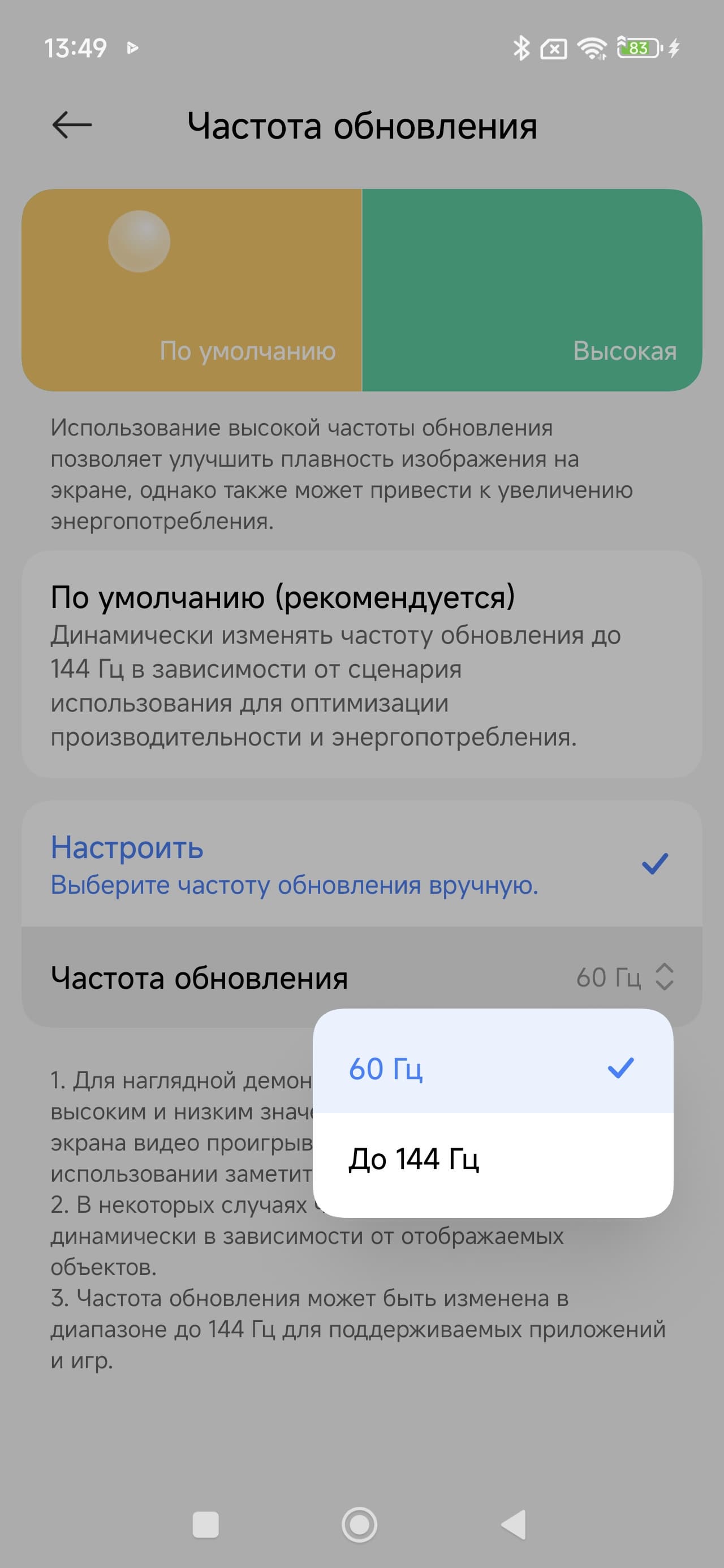 В настройках экрана можно включить режим с повышенной до 144 Гц частотой обновления: