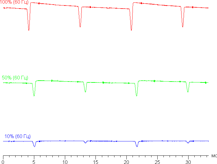 На любом уровне яркости присутствует значимая модуляция с частотой 120 Гц. На рисунке ниже приведены зависимости яркости (вертикальная ось) от времени (горизонтальная ось) для нескольких значений настройки яркости. Режим с частотой обновления 60 Гц: