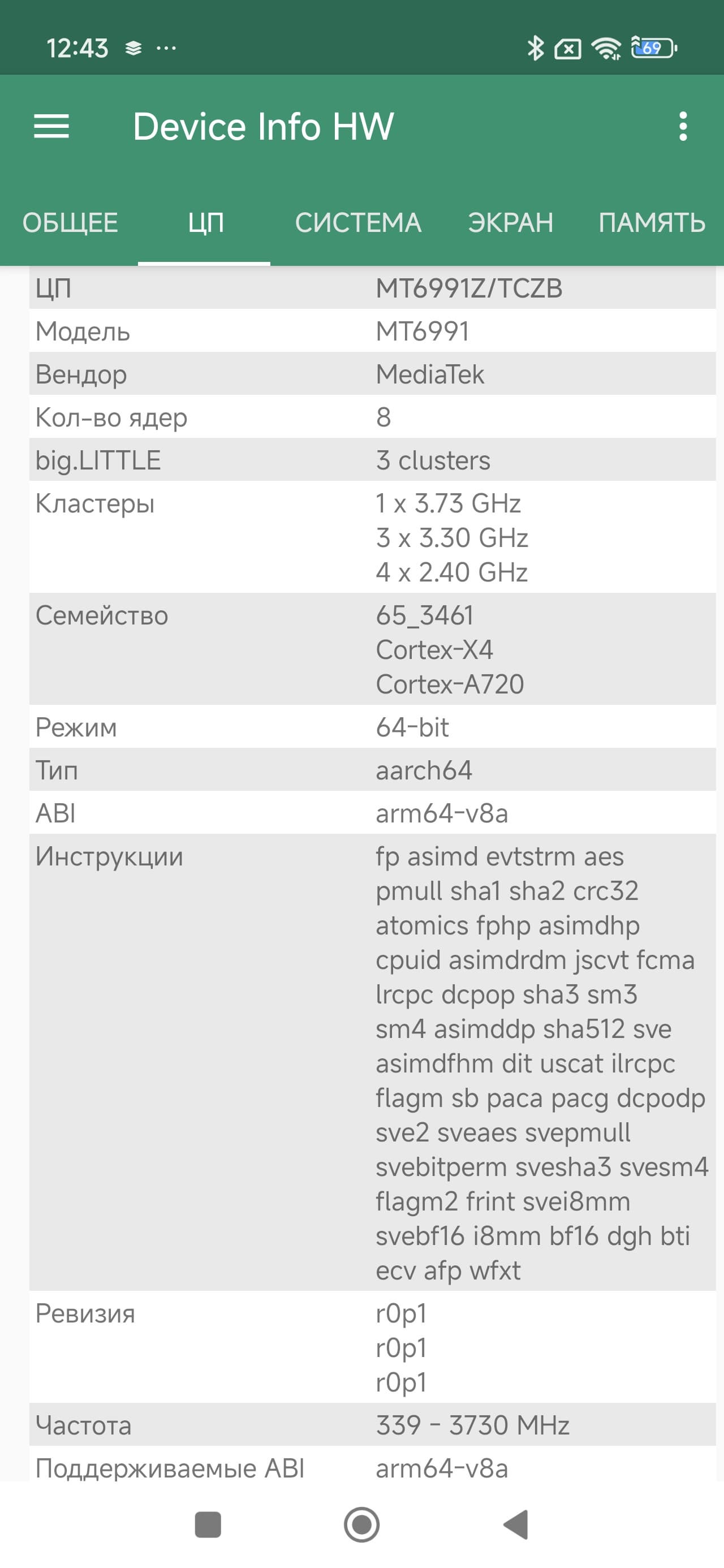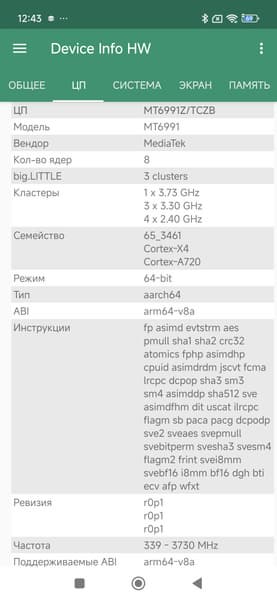 - SoC Mediatek Dimensity 9400+, 8 процессорных ядер (1×Cortex-X925 @3,63 ГГц + 3×Cortex-X4 @3,3 ГГц + 4×Cortex-A720 2,4 ГГц)
