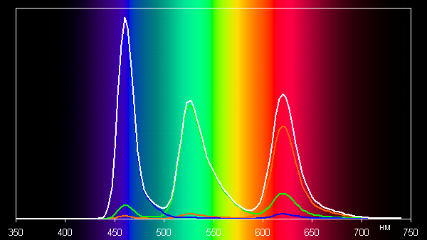 В первом случае спектры компонент (то есть спектры чистых красного, зеленого и синего цветов) очень хорошо разделены: