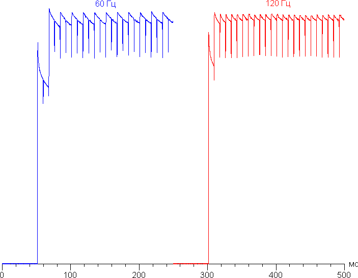 Переключение состояния элементов матрицы выполняется практически мгновенно, но на фронте включения может присутствовать ступенька, ширина которой зависит от текущей частоты обновления. Для частоты обновления в 60 Гц это примерно 17 мс, для 120 Гц — примерно 8 мс. Например, так выглядит зависимость яркости (вертикальная ось) от времени (горизонтальная ось) при переходе от черного к белому (режим 60 Гц и 120 Гц):