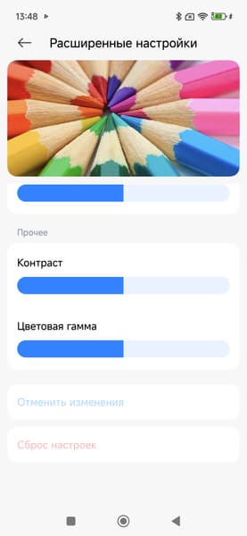 Фотография выше получена для профиля Исходный в настройках экрана. Базовых профилей три, а на вкладке Расширенные настройки можно выбирать еще три профиля и менять цветовой баланс многочисленными настройками и т.д: