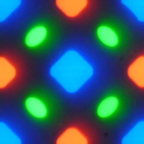 В этом экране используется матрица OLED — активная матрица на органических светодиодах. Полноцветное изображение создается с помощью субпикселей трех цветов — красного (R), зеленого (G) и синего (B), но красных и синих субпикселей в два раза меньше, что можно обозначить как RGBG. Это подтверждается фрагментом микрофотографии: