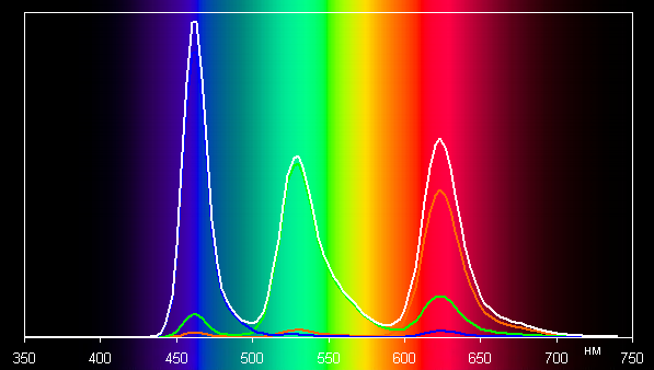 В первом случае спектры компонент (то есть спектры чистых красного, зеленого и синего цветов) очень хорошо разделены: