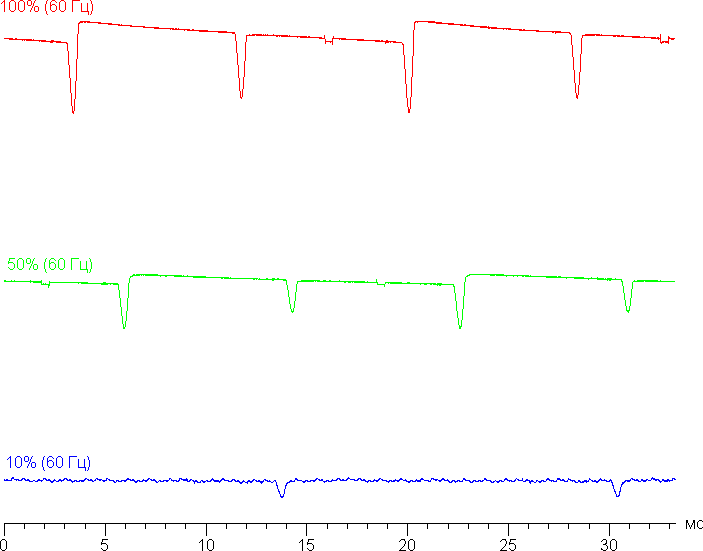 На любом уровне яркости присутствует значимая модуляция с частотой 60 или 120 Гц. На рисунке ниже приведены зависимости яркости (вертикальная ось) от времени (горизонтальная ось) для нескольких значений настройки яркости. Режим с частотой обновления 60 Гц: