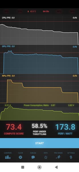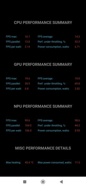 Тест на снижение производительности при нагреве мы проводим с помощью программы Burnout Benchmark, которая позволяет нагружать CPU, GPU и NPU. Уровень тротлинга, согласно тестам, не очень высок, а GPU (что важно для игр) и вовсе почти не тротлится.