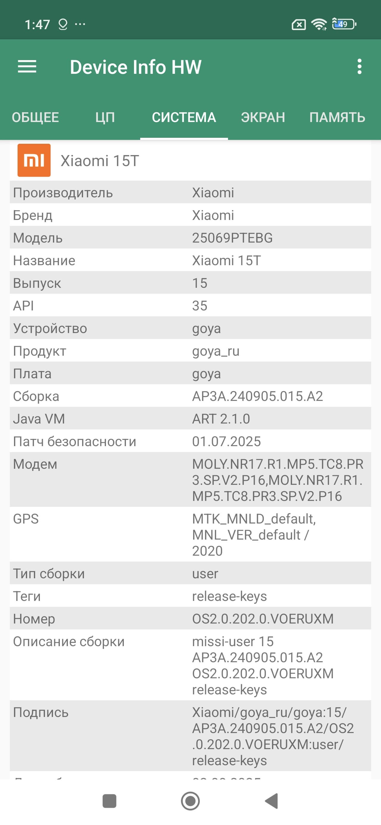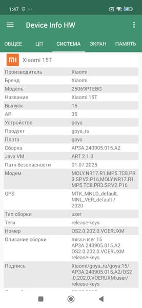 Основные характеристики Xiaomi 15T (модель 25069PTEBG)