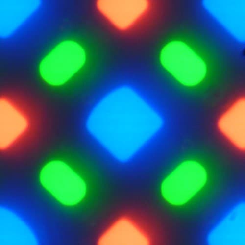 В этом экране используется матрица OLED — активная матрица на органических светодиодах. Полноцветное изображение создается с помощью субпикселей трех цветов — красного (R), зеленого (G) и синего (B), но красных и синих субпикселей в два раза меньше, что можно обозначить как RGBG. Это подтверждается фрагментом микрофотографии: