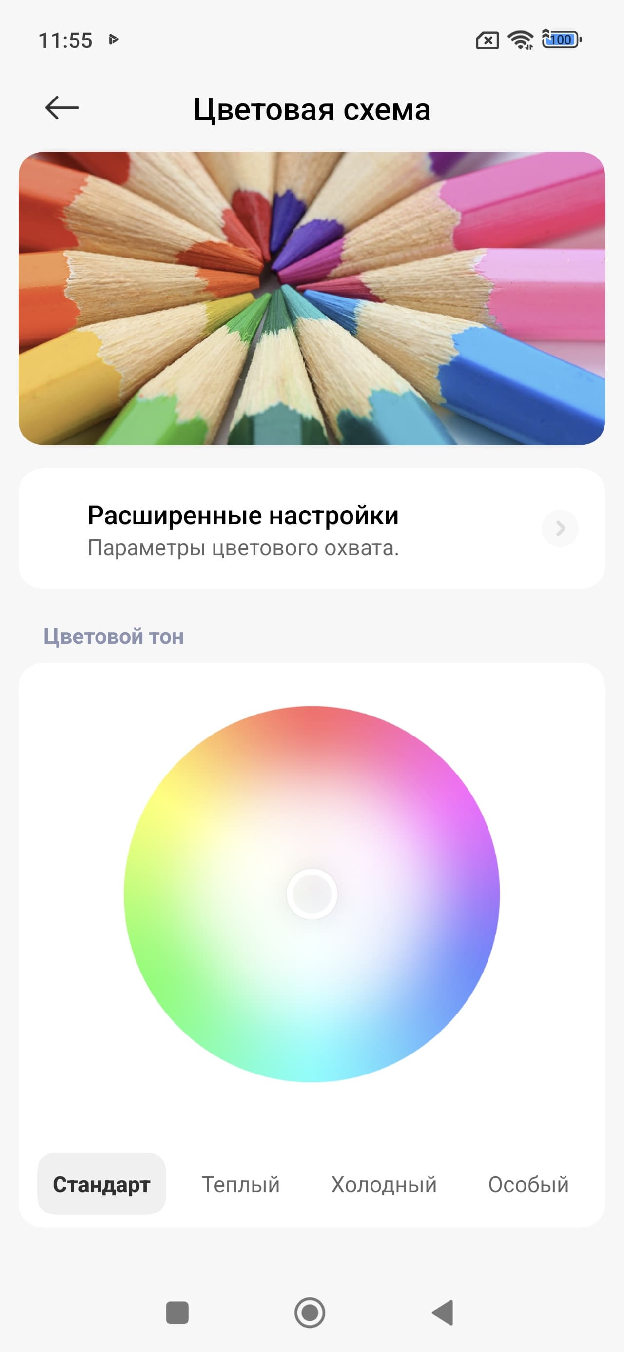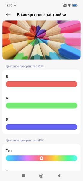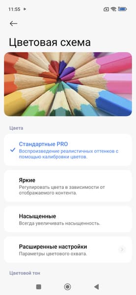 Фотография выше получена для профиля Исходный в настройках экрана. Базовых профилей три, а на вкладке Расширенные настройки можно выбирать еще три профиля и менять цветовой баланс многочисленными настройками и т.д: