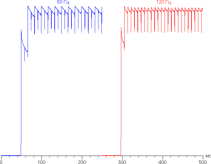 Переключение состояния элементов матрицы выполняется практически мгновенно, но на фронте включения может присутствовать ступенька, ширина которой зависит от текущей частоты обновления. Для частоты обновления в 60 Гц это примерно 17 мс, для 120 Гц — примерно 8 мс. Например, так выглядит зависимость яркости (вертикальная ось) от времени (горизонтальная ось) при переходе от черного к белому (режим 60 Гц и 120 Гц):