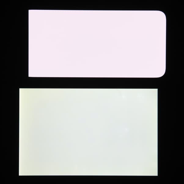 Экран характеризуется великолепными углами обзора. Яркость под углом у обоих экранов заметно уменьшается (если сравнивать с Nexus 7), но в случае смартфона падение яркости выражено гораздо меньше. В итоге, даже если установить формально одинаковую яркость, то экран этого смартфона визуально выглядит гораздо более ярким (в сравнении с ЖК-экранами), так как на экран мобильного устройства часто приходится смотреть как минимум под небольшим углом. Правда, у смартфона белый цвет при отклонении на большие углы приобретает легкий сине-зеленый оттенок, но черный цвет остается просто черным под любыми углами. Черный цвет, разумеется, остается просто черным под любыми углами. Он настолько черный, что параметр контрастности в данном случае неприменим. Для сравнения приведем фотографии, на которых на экраны смартфона и второго участника сравнения выведены одинаковые изображения, при этом яркость экранов изначально установлена примерно на 200 кд/м², а цветовой баланс на фотоаппарате принудительно переключен на 6500 К.