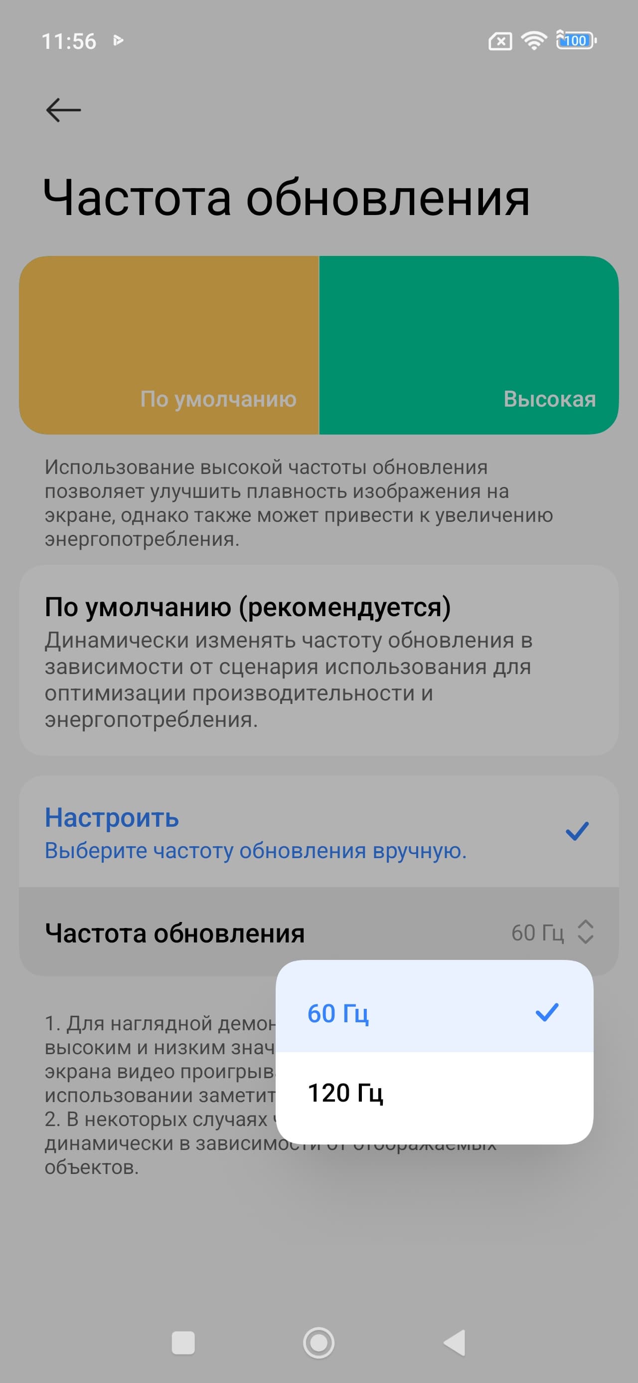 В настройках экрана можно включить режим с повышенной до 120 Гц частотой обновления: