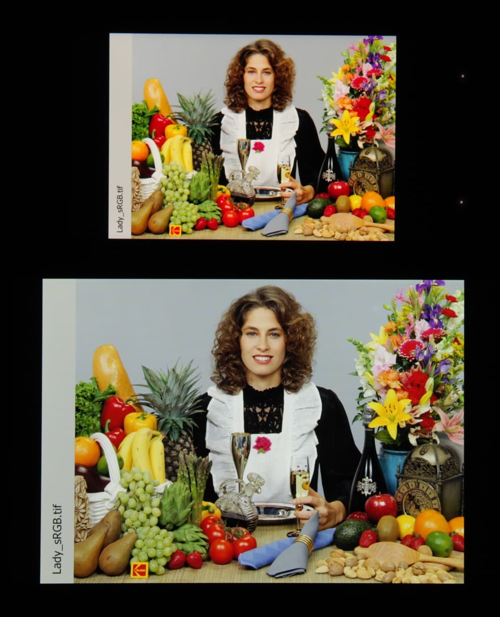 Такие спектры (к сожалению) встречаются в топовых мобильных устройствах Sony и других производителей. По всей видимости, в этом экране используются светодиоды с синим излучателем и зеленым и красным люминофором (обычно — синий излучатель и желтый люминофор), что в сочетании со специальными светофильтрами матрицы и позволяет получить широкий цветовой охват. Да, и в красном люминофоре, видимо, используются так называемые квантовые точки. Для потребительского устройства широкий цветовой охват является никак не достоинством, а существенным недостатком, так как в итоге цвета изображений — рисунков, фотографий и фильмов, — ориентированных на пространство sRGB (а таких подавляющее большинство), имеют неестественную насыщенность. Особенно это заметно на узнаваемых оттенках, например на оттенках кожи. Результат приведен на фотографии выше.
