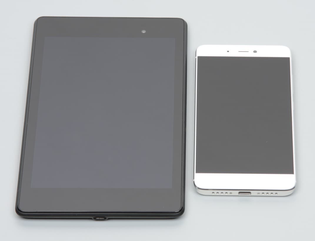 Лицевая поверхность экрана выполнена в виде стеклянной пластины с зеркально-гладкой поверхностью, устойчивой к появлению царапин. Судя по отражению объектов антибликовые свойства экрана лучше, чем у экрана Google Nexus 7 (2013) (далее просто Nexus 7). Для наглядности приведем фотографию, на которой в выключенных экранах отражается белая поверхность (слева — Nexus 7, справа — Xiaomi Mi 5s, далее их можно различать по размеру):