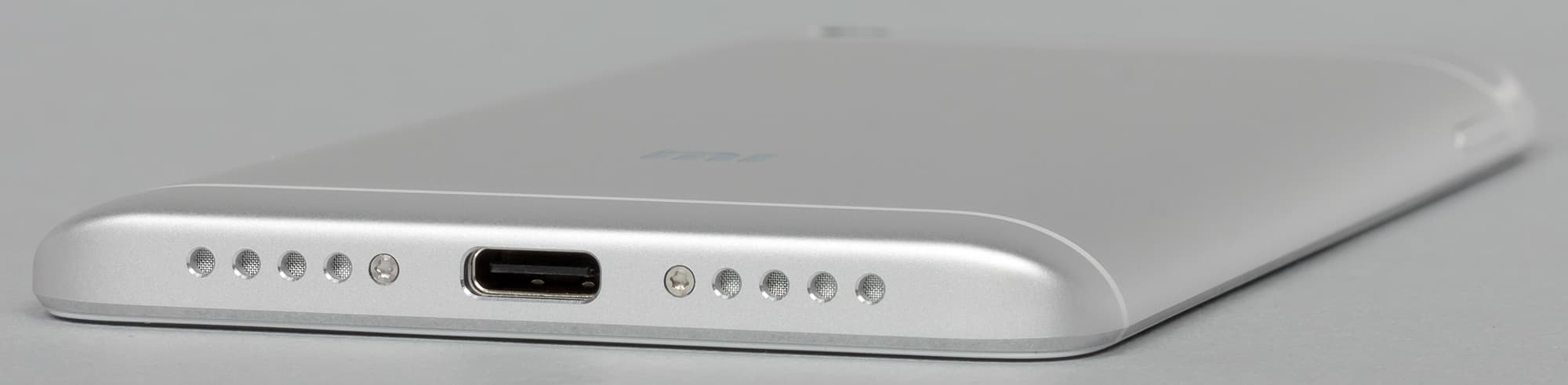 В нижнем торце установлен разъем USB Type-C, поддерживающий подключение внешних устройств, и в том числе флэш-накопителей, в режиме USB OTG. Рядом с разъемом вырезаны два симметричных ряда отверстий, но звук из динамика выходит лишь через один из них. (За другим, по всей видимости, скрывается разговорный микрофон.) Звучит динамик не так громко и не так насыщенно, как в более крупной модели Mi 5s Plus — там, по всей видимости, установлен более мощный динамик. Но в целом аппарат по звуковым возможностям неплох, хотя и не лучше среднего уровня.
