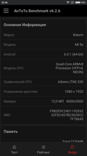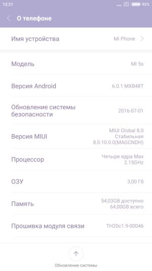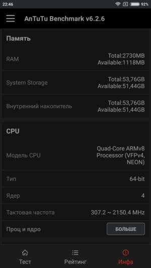 Как бы то ни было, в конфигурацию чипа здесь входит четыре процессорных ядра Kryo в двух кластерах, максимальная частота старших ядер достигает 2,15 ГГц (против 2,34 ГГц у Mi 5s Plus). За обработку графики отвечает видеоускоритель Adreno 530, частота его ядер также была понижена до 624 МГц (против 652 МГц у Mi 5s Plus). Объем ОЗУ составляет 3 или 4 ГБ, а встроенной памяти — 32, 64 или 128 ГБ в зависимости от конфигурации. Около 57 ГБ остаются свободными у модели с 64 ГБ флэш-памяти, и примерно 1,4 из 3 ГБ ОЗУ обычно свободно после свежей перезагрузки и очистки памяти.