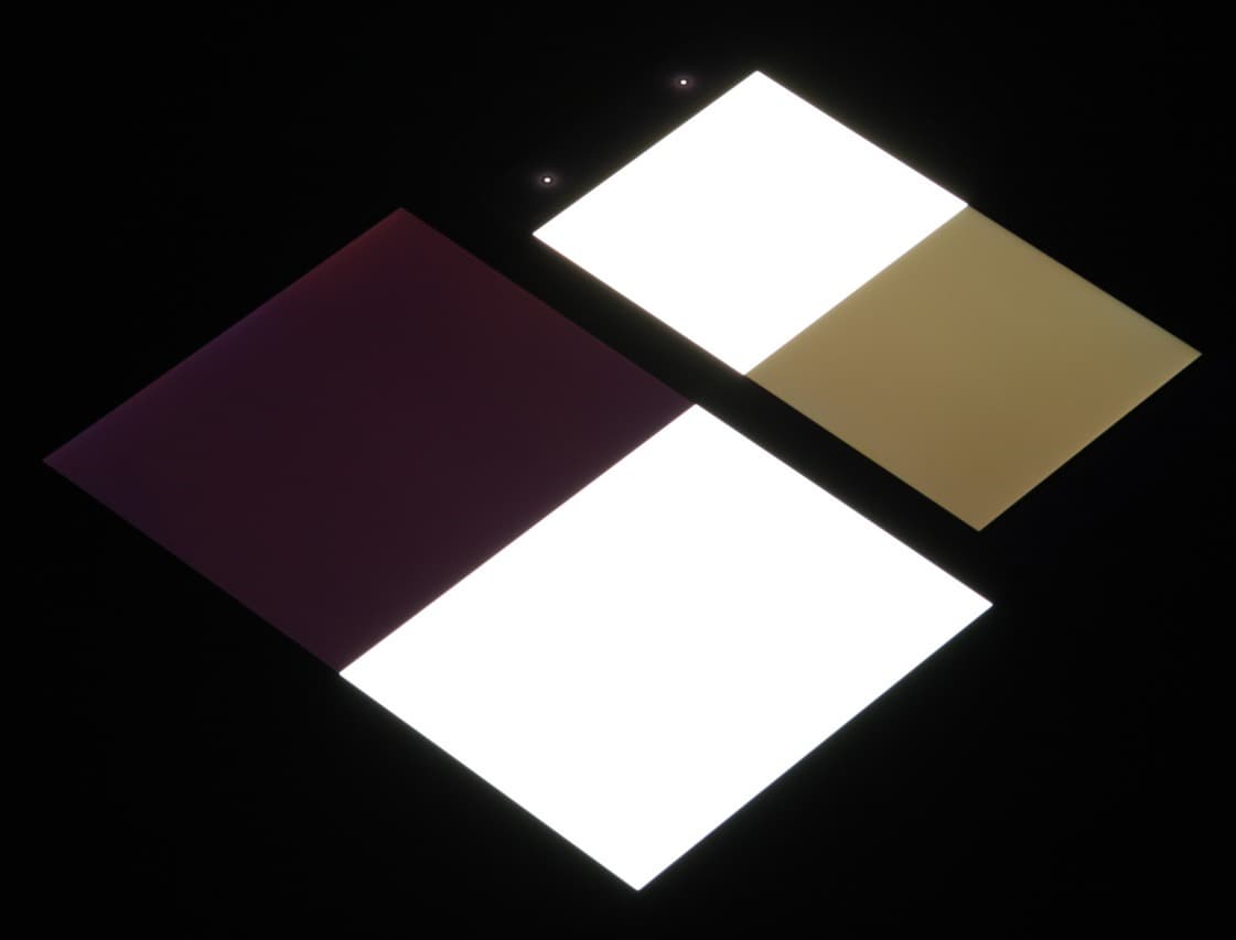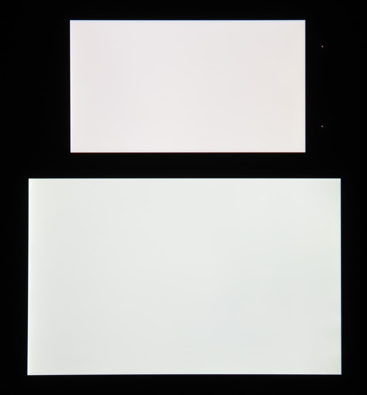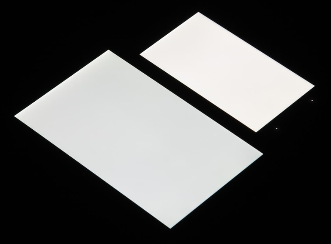Яркость под углом у экранов сильно уменьшилась, но у Xiaomi Mi 5s экран все же ярче. Черное поле при отклонении по диагонали высветляется сильно и приобретает желтоватый оттенок. Фотографии ниже это демонстрируют (яркость белых участков в перпендикулярном плоскости экранов направлении одинаковая!):