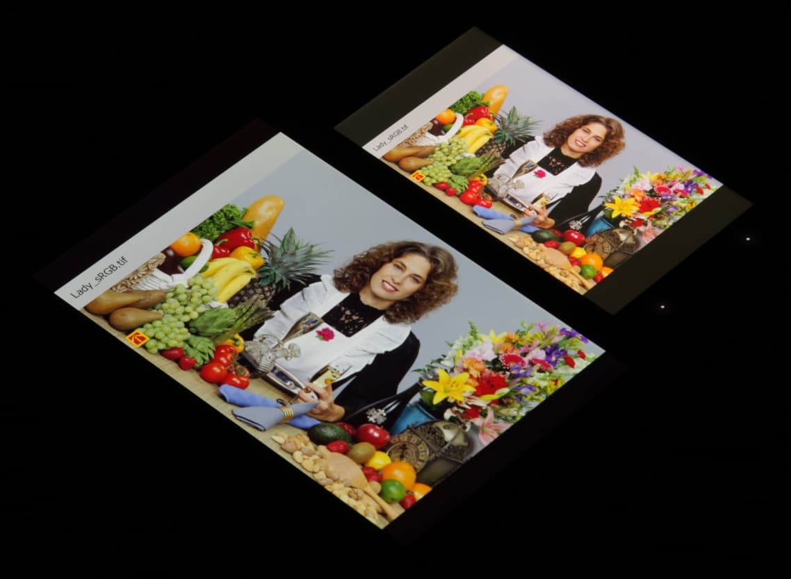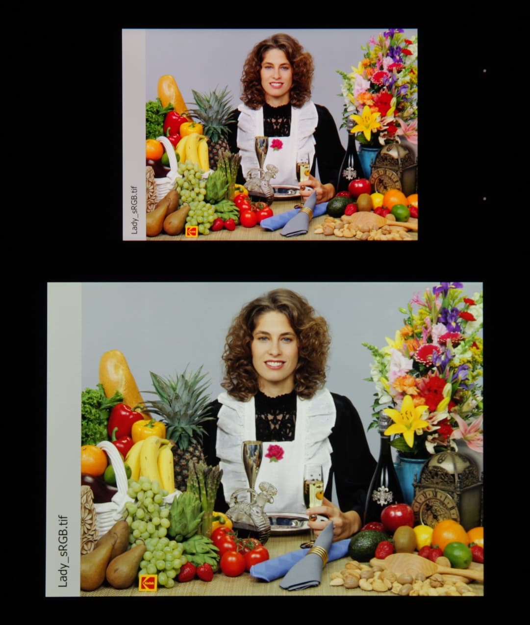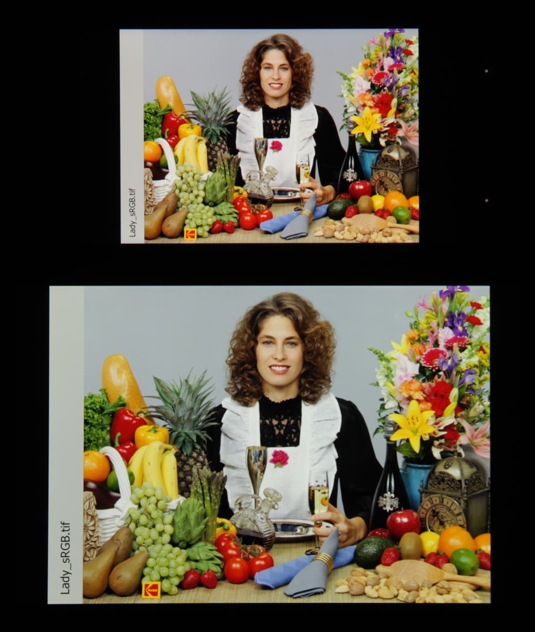 Такие спектры (к сожалению) встречаются в топовых мобильных устройствах Sony и других производителей. По всей видимости, в этом экране используются светодиоды с синим излучателем и зеленым и красным люминофором (обычно — синий излучатель и желтый люминофор), что в сочетании со специальными светофильтрами матрицы и позволяет получить широкий цветовой охват. Да, и в красном люминофоре, видимо, используются так называемые квантовые точки. Для потребительского устройства широкий цветовой охват является никак не достоинством, а существенным недостатком, поскольку в итоге цвета изображений — рисунков, фотографий и фильмов, — ориентированных на пространство sRGB (а таких подавляющее большинство), имеют неестественную насыщенность. Особенно это заметно на узнаваемых оттенках, например на оттенках кожи. Результат приведен на фотографии выше.