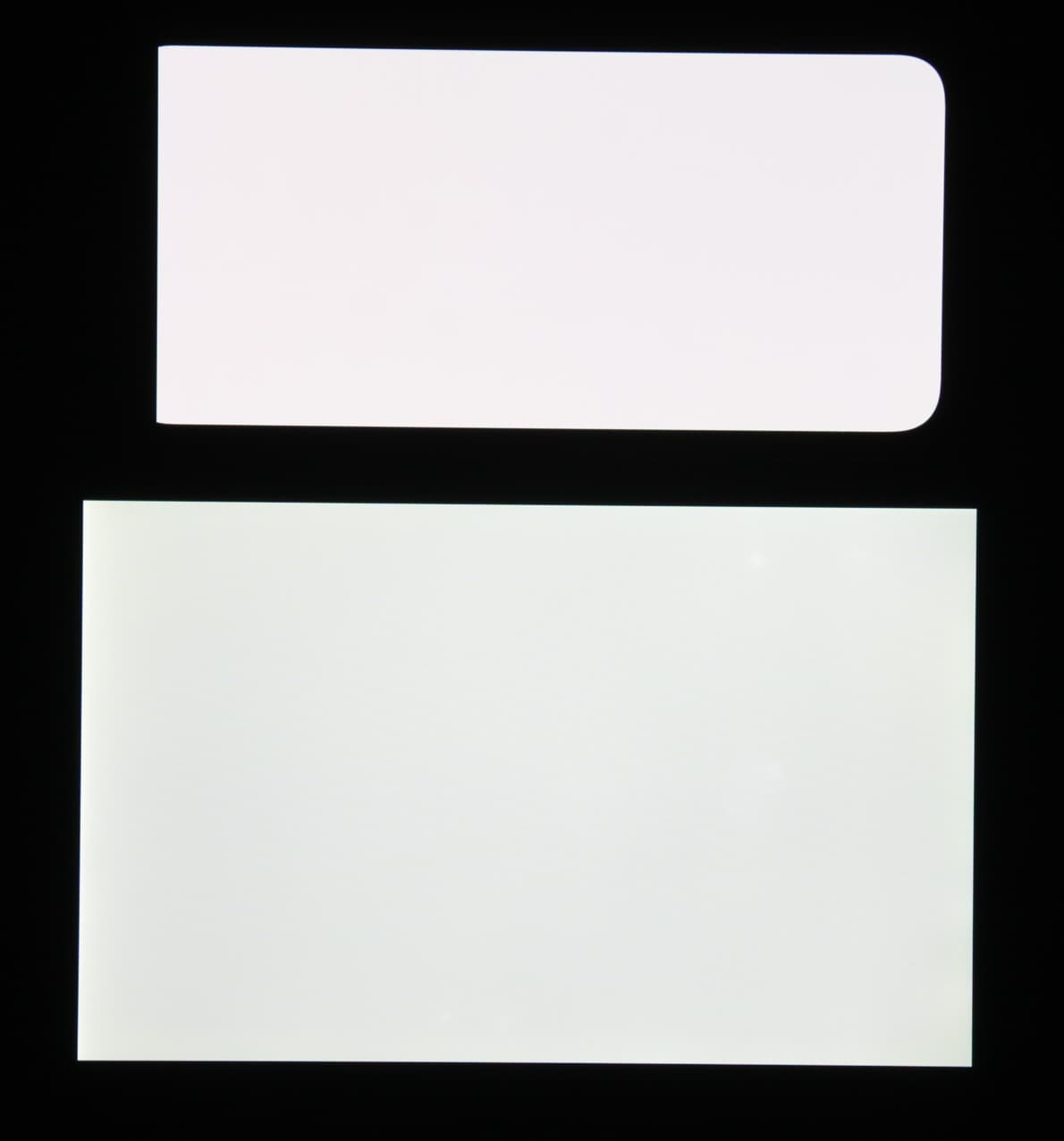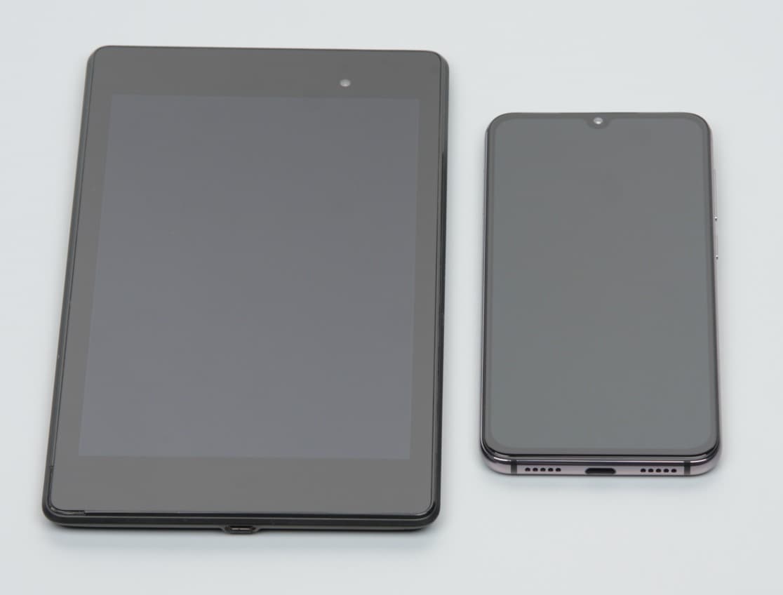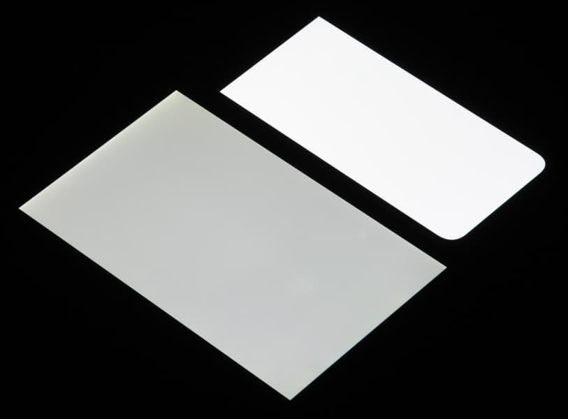 Лицевая поверхность экрана выполнена в виде стеклянной пластины с зеркально-гладкой поверхностью, устойчивой к появлению царапин. Судя по отражению объектов, антибликовые свойства экрана не хуже, чем у экрана Google Nexus 7 (2013) (далее просто Nexus 7). Для наглядности приведем фотографию, на которой в выключенных экранах отражается белая поверхность (слева — Nexus 7, справа — Xiaomi Mi 9 SE, далее их можно различать по размеру):