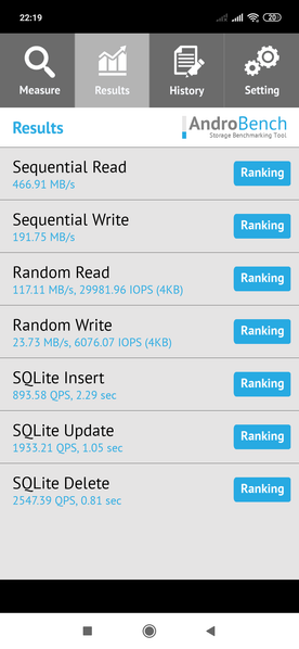 Результаты теста AndroBench на скорость работы с памятью: