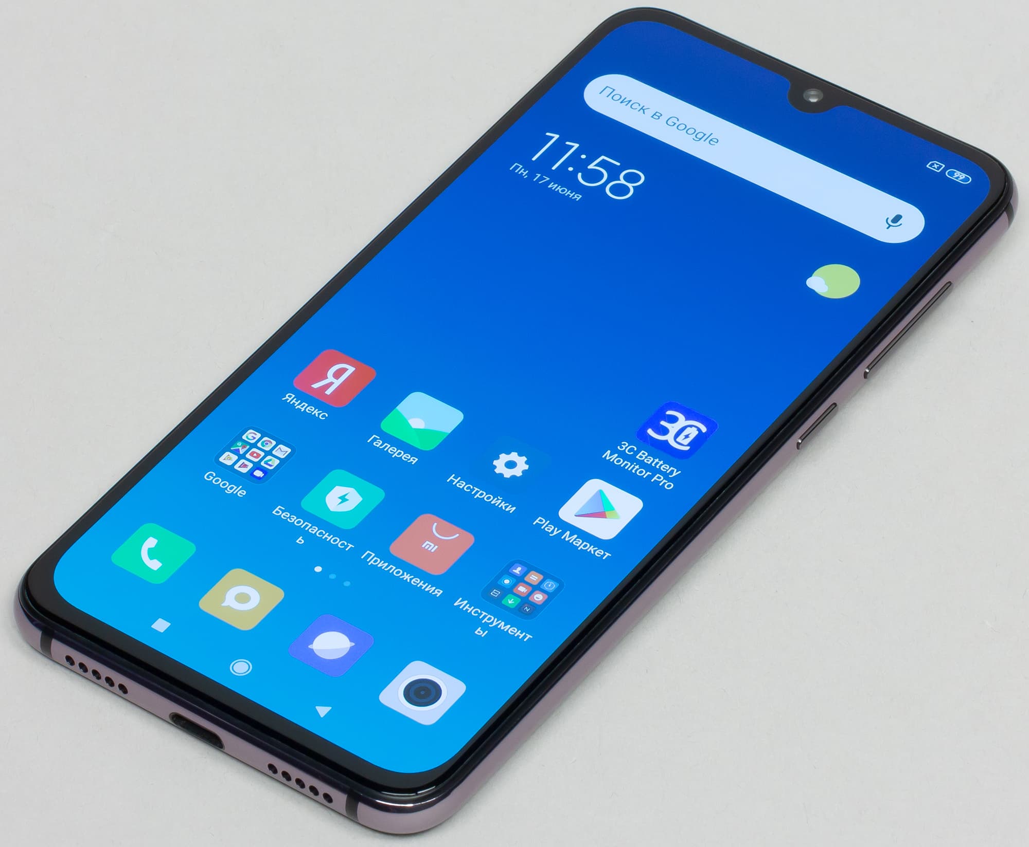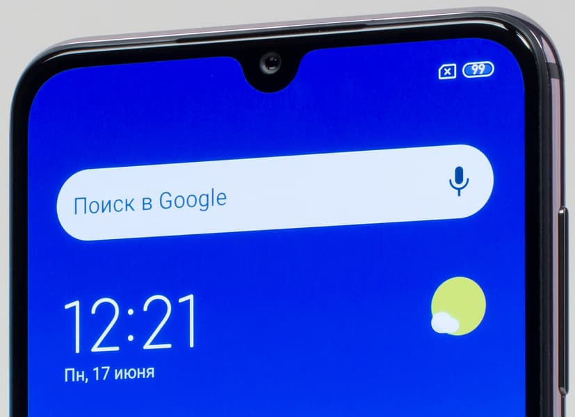 В верхней части экрана присутствует небольшой каплевидный вырез под камеру, отнимающий минимальное количество места у дисплея, и это самый лучший вариант на сегодняшний день. С довольно тонкими рамками такой дисплей занимает около 90% площади передней поверхности.