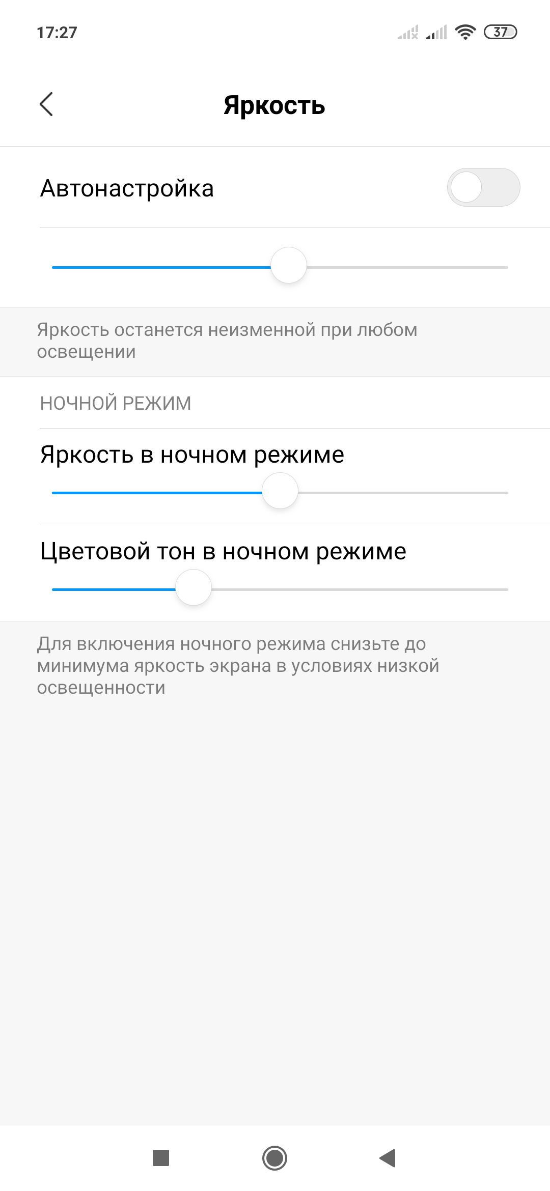 Конечно, есть режим с уменьшенной интенсивностью синей компоненты. Напомним, что, в принципе, яркий свет может приводить к нарушению суточного (циркадного) ритма (см. статью про iPad Pro с дисплеем 9,7 дюйма), но все решается подстройкой яркости до комфортного уровня, а искажать цветовой баланс, уменьшая вклад синего, нет абсолютно никакого смысла. Есть и еще один вариант управления яркостью и цветовым тоном: привязка выбора минимальной яркости и тона к установке яркости на минимум (в ручном или в автоматическом режиме). Пользы от данной функции также не наблюдается: