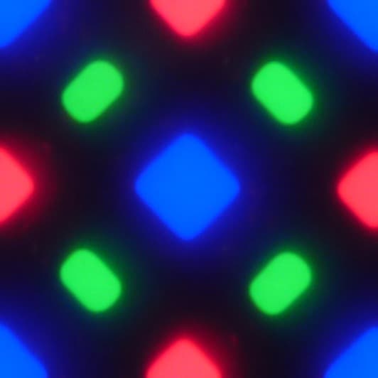 В этом экране используется матрица Super AMOLED — активная матрица на органических светодиодах. Полноцветное изображение создается с помощью субпикселей трех цветов — красного (R), зеленого (G) и синего (B), но красных и синих субпикселей в два раза меньше, что можно обозначить как RGBG. Это подтверждается фрагментом микрофотографии:
