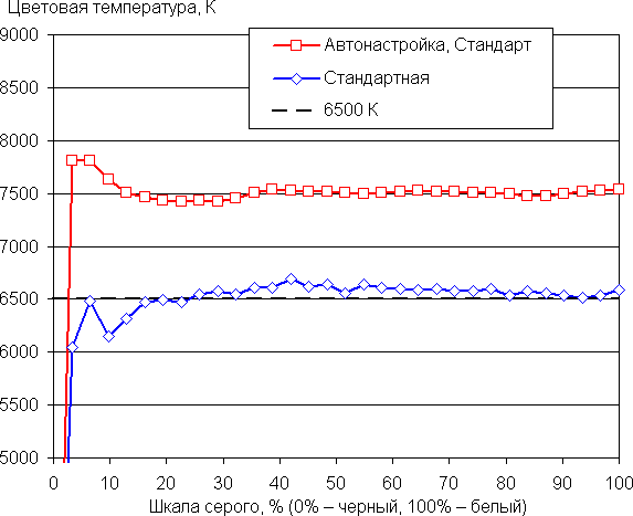В этом устройстве есть возможность скорректировать цветовой баланс с помощью регулировки оттенка точкой на цветовом круге, но именно в правильном профиле Стандартная эта настройка неактивна. Впрочем, как для этого профиля, так и для профиля Автонастройка после выбора варианта Теплый баланс оттенков на шкале серого хороший, поскольку цветовая температура несильно выше стандартных 6500 К, а отклонение от спектра абсолютно черного тела (ΔE) ниже 10, что для потребительского устройства считается неплохим показателем. При этом цветовая температура мало изменяется от оттенка к оттенку — это положительно сказывается на визуальной оценке цветового баланса. По умолчанию выбран профиль Стандарт, в котором цветовая температура выше, но не критично. (Самые темные области шкалы серого можно не учитывать, так как там баланс цветов не имеет большого значения, да и погрешность измерений цветовых характеристик на низкой яркости большая.)