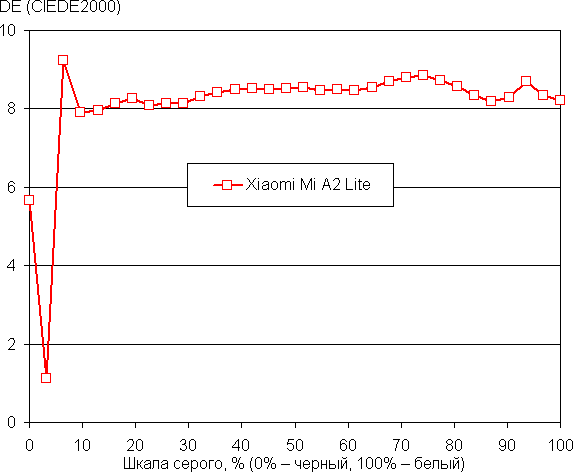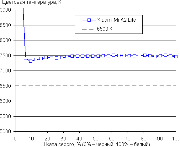 Баланс оттенков на шкале серого хороший, поскольку цветовая температура несильно выше стандартных 6500 К, а отклонение от спектра абсолютно черного тела (ΔE) ниже 10, что для потребительского устройства считается неплохим показателем. При этом цветовая температура и ΔE мало изменяются от оттенка к оттенку — это положительно сказывается на визуальной оценке цветового баланса. (Самые темные области шкалы серого можно не учитывать, так как там баланс цветов не имеет большого значения, да и погрешность измерений цветовых характеристик на низкой яркости большая.)
