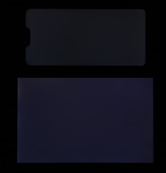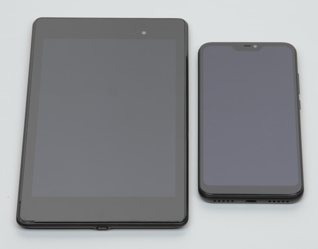 Лицевая поверхность экрана выполнена в виде стеклянной пластины с зеркально-гладкой поверхностью, устойчивой к появлению царапин. Судя по отражению объектов, антибликовые свойства экрана не хуже, чем у экрана Google Nexus 7 (2013) (далее просто Nexus 7). Для наглядности приведем фотографию, на которой в выключенных экранах отражается белая поверхность (слева — Nexus 7, справа — Xiaomi Mi A2 Lite, далее их можно различать по размеру):