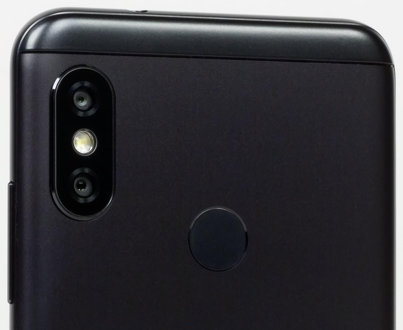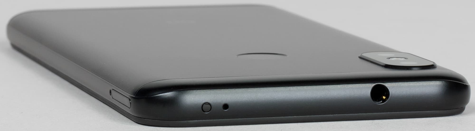 На верхнем торце можно найти не только маленькое отверстие вспомогательного микрофона, но и глазок ИК-порта для эмуляции пульта ДУ. Одно из разочарований от Xiaomi Mi A2 — отсутствие 3,5-миллиметрового аудиовыхода на наушники. А здесь — ничего, установили его, и мир не рухнул. Вроде бы две модели одного подсемейства, а какие отличия: и разъем для наушников оставили, и для карты памяти место нашлось в более мелком корпусе, просто удивительно.