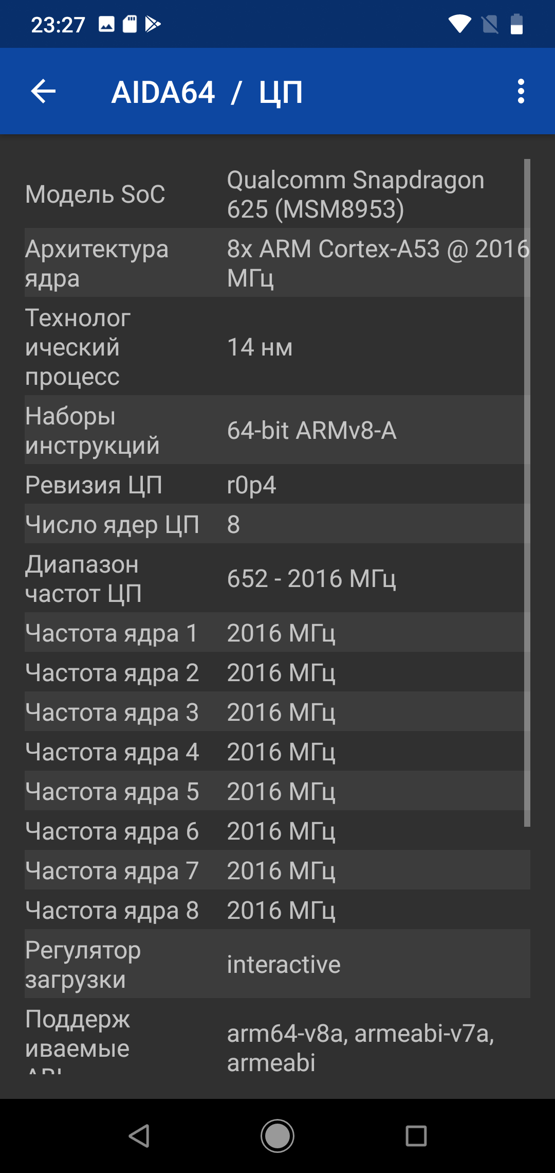 - SoC Qualcomm Snapdragon 625, 8 ядер Cortex-A53 @2,0 ГГц