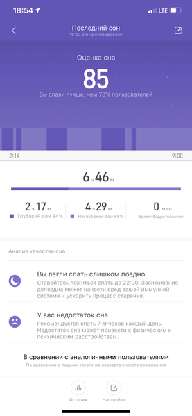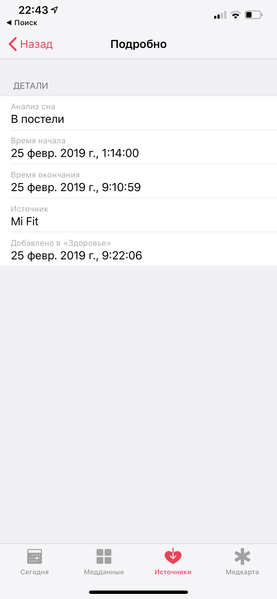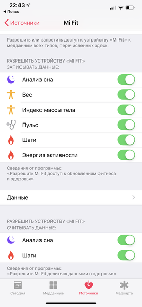 Сопряжение со смартфоном (мы использовали iPhone Xs Max) проходит без проблем. После удачного соединения приложение предлагает создать аккаунт и провести первоначальную настройку: ввести свой рост-вес-возраст, указать цели, разрешить или запретить обмен данными с приложением «Здоровье» (Apple Health). Надо сказать, что разрешить это действительно имеет смысл, поскольку отображение результатов по сну и сердечному пульсу в «Здоровье» более удобное, чем в собственном приложении Xiaomi.