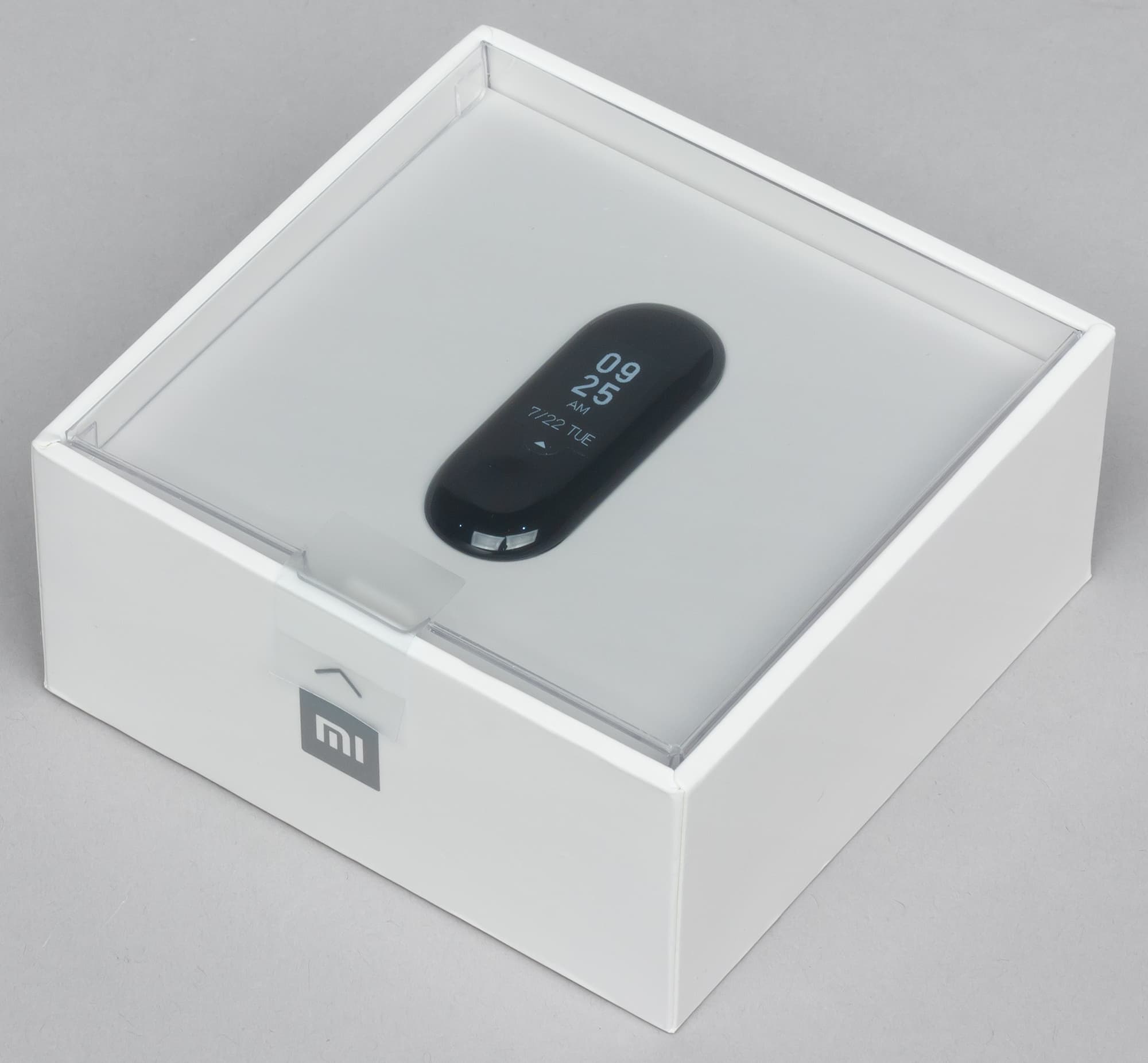 Браслет поставляется в компактной квадратной коробочке с прозрачной верхней крышкой, через которую видно само устройство.