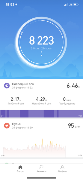 Ниже расположена информация о сне, пульсе и весе. Но на последнее браслет, естественно, влиять не может. Поэтому если у вас нет весов Xiaomi, то там будет указано то значение, которое вы ввели. Что же касается активности, сна и пульса, то нажав на любой из этих параметров, вы можете увидеть подробности.