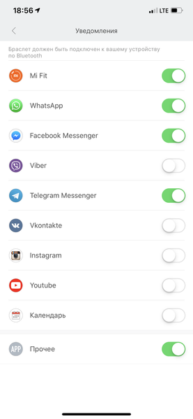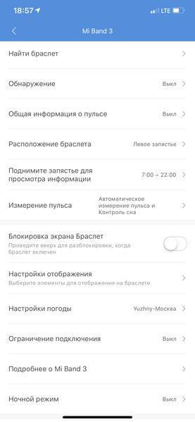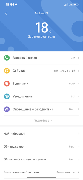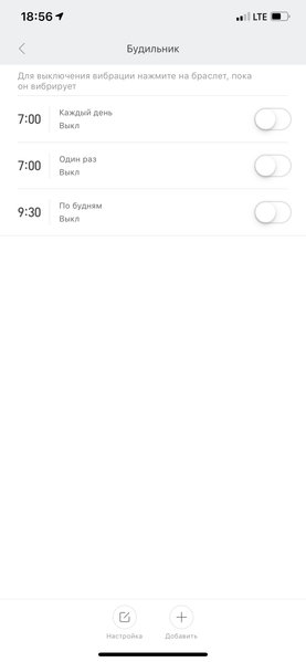 Помимо этого есть и ряд других настроек — в частности, о том, какие уведомления присылать на браслет, использовать ли автоматическое включение экрана при поднятии руки и прочее. Плюс ко всему, можно настроить будильник: в заданное время браслет будет вибрировать. А вот функция умного будильника здесь не предусмотрена.