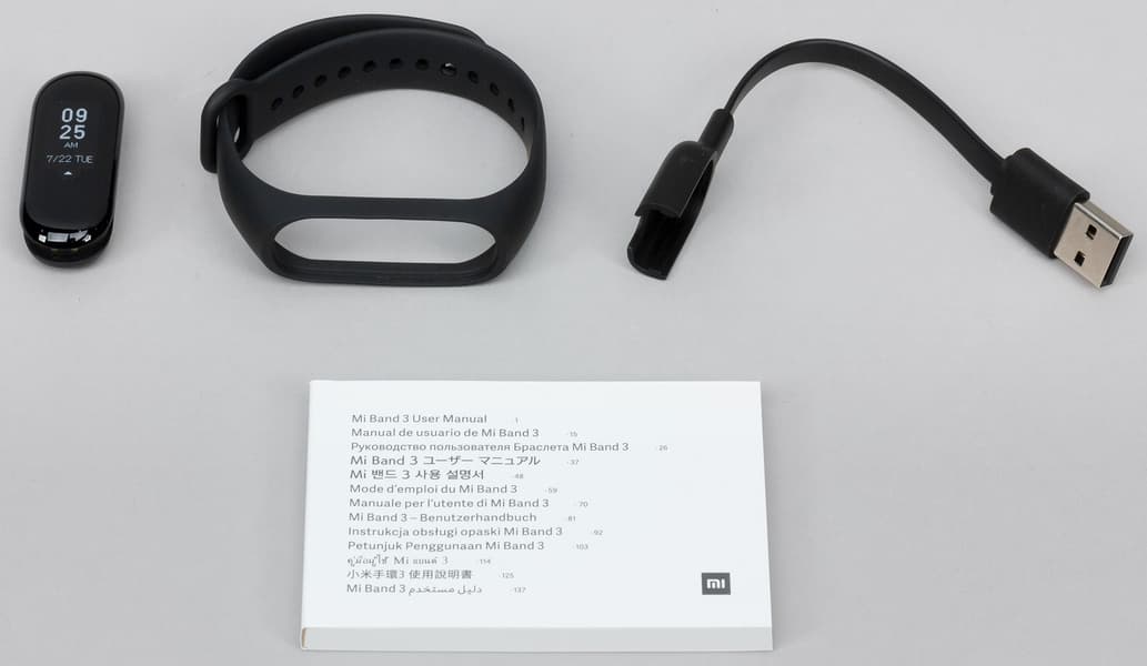 Внутри коробки, весьма стильной, как это обычно и бывает у Xiaomi, можно обнаружить сам гаджет, силиконовый браслет, короткий кабель USB для подзарядки и пухленькое руководство пользователя, где есть и информация на русском языке.