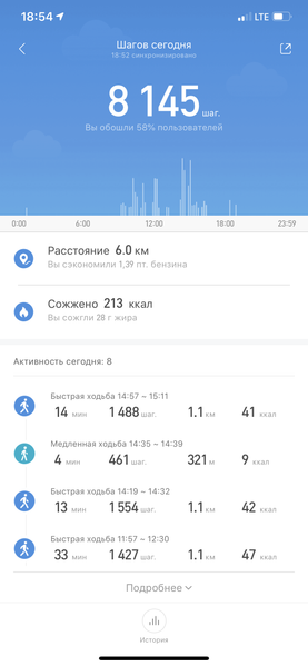 Но — вернемся к Mi Fit. Основная функциональность этого приложения очень проста. На главном экране в большом круге отображается количество шагов, километров, пройденных за день, и сброшенных калорий. Сам круг показывает прогресс — сколько еще осталось до достижения цели.