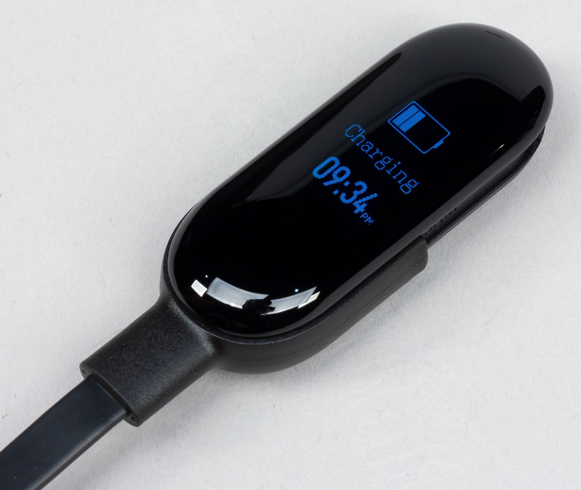 Для подзарядки Xiaomi Mi Band 3 эту «капсулу» надо извлечь из ремешка и вставить одной из сторон в соответствующую нишу комплектного кабеля, после чего подсоединить другой его конец к разъему USB-A любого смартфона/планшета или компьютера.
