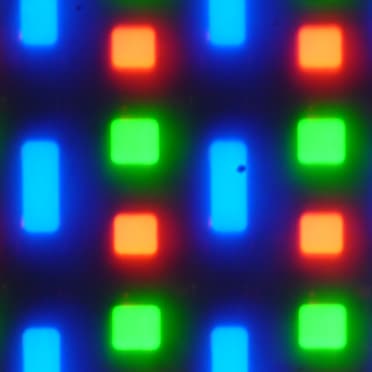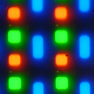 Микрофотография экрана показывает, что матрица составлена из субпикселей красного, зеленого и синего цветов в равном количестве: