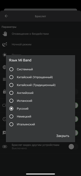 Иное дело, если вы купите браслет у официальных реселлеров в России. Тогда уже при первом включении вы увидите English среди языков и вся настройка будет проходить на английском. А уже затем через Mi Fit можно будет активировать настройку «Использовать язык смартфона». Соответственно, если у вас на смартфоне русский, нужные шрифты подгрузятся в браслет и после перезагрузки меню будет русскоязычным.