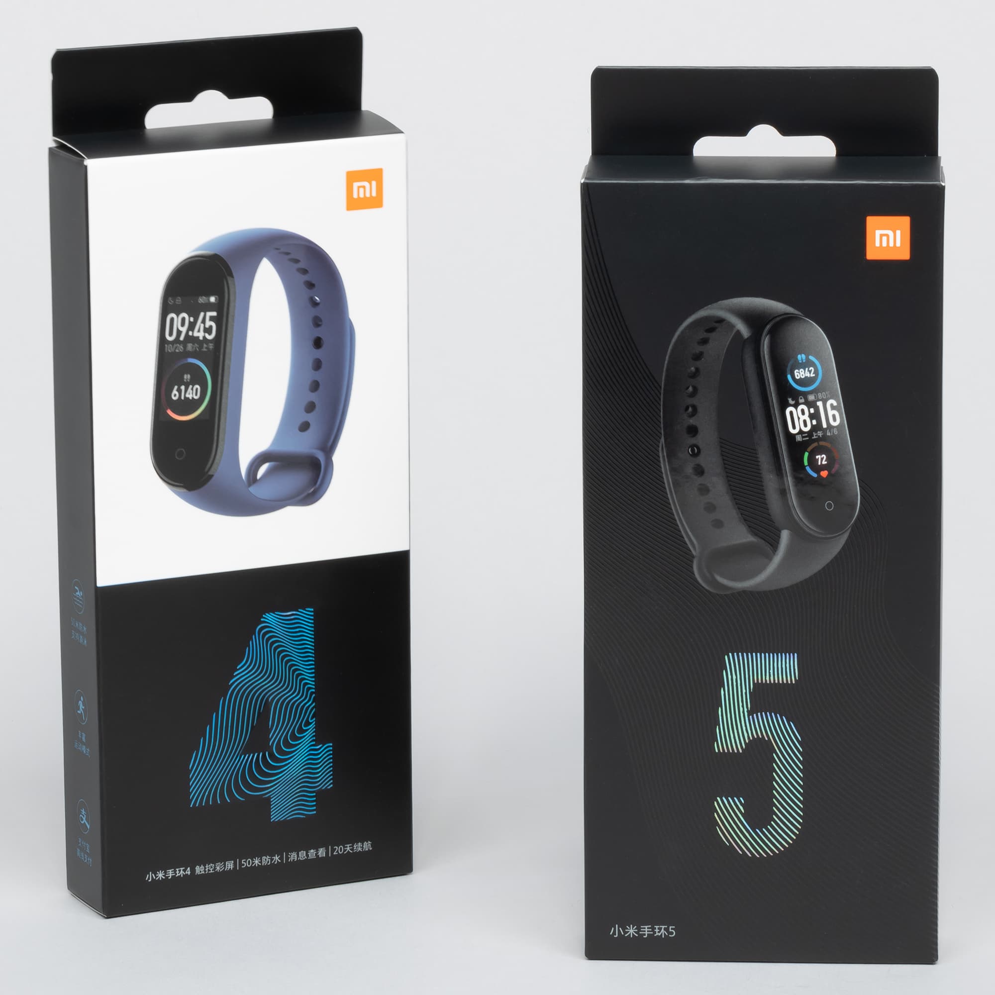 Браслеты поставляется в одинаковых по размеру коробках вытянутой формы. На той, что с Mi Band 4, крупно написана цифра 4, на другом, соответственно, 5. При этом, коробка с Mi Band 5 полностью черная, что выглядит более эффектно. Правда, технические характеристики и там, и там на китайском.